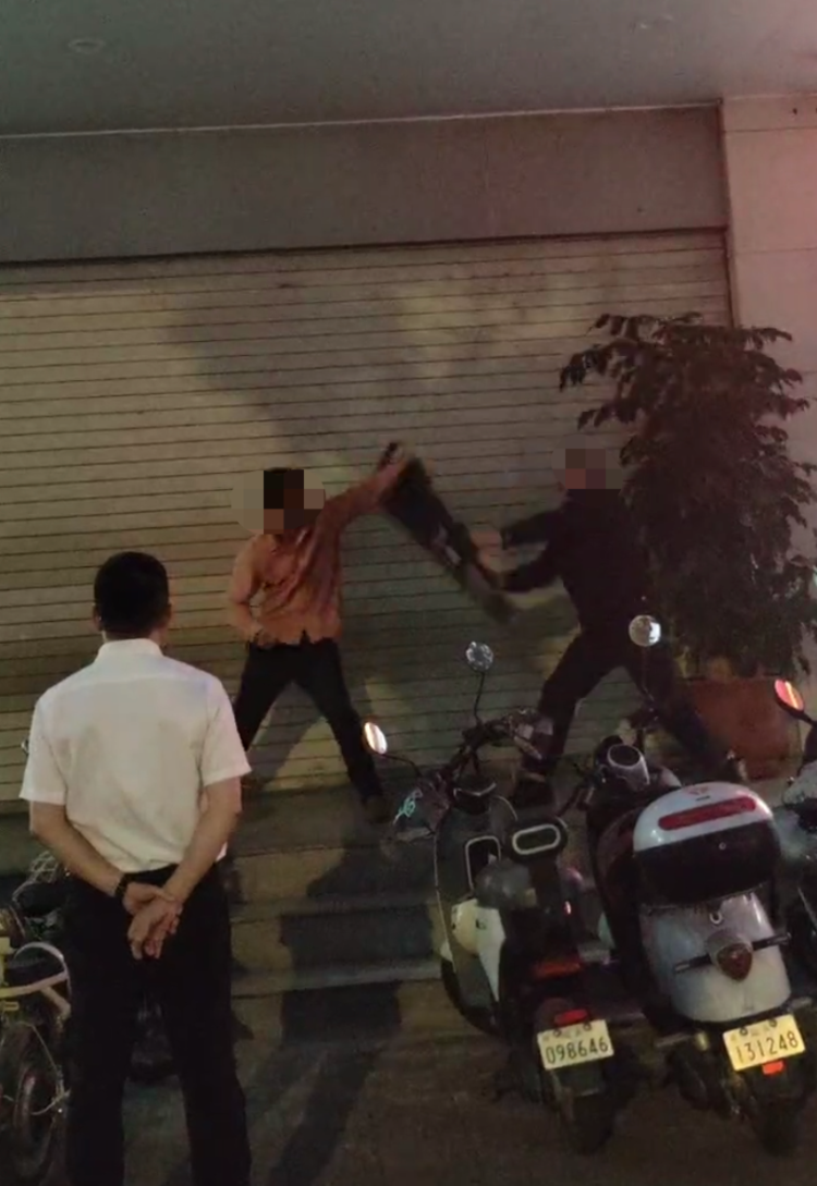 记者从视频中看到,一名中年男子情绪激动地在自动柜员机附近徘徊,一边指向银行方向,现场也有两名穿着制服的人员。视频中,男子疑似与现场人员发生争执,用手指对方,情绪较激动。随后着制服人员手持防暴盾击打中年男子,中年男子用手格挡发出很大的声响,周围也有不少银行工作人员和路人围观,还有工作人员拿着手机拍摄情况。