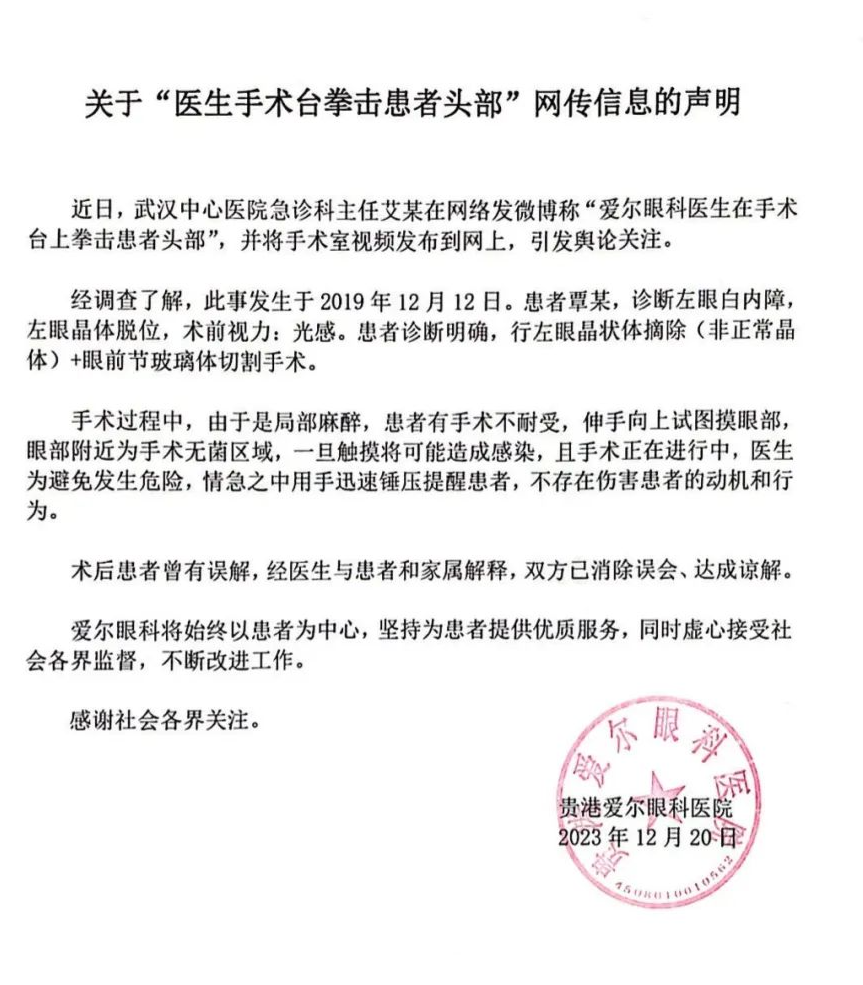 12月21日凌晨,贵港爱尔眼科微信公众号发布关于“医生手术台拳击患者头部”网传信息的声明。