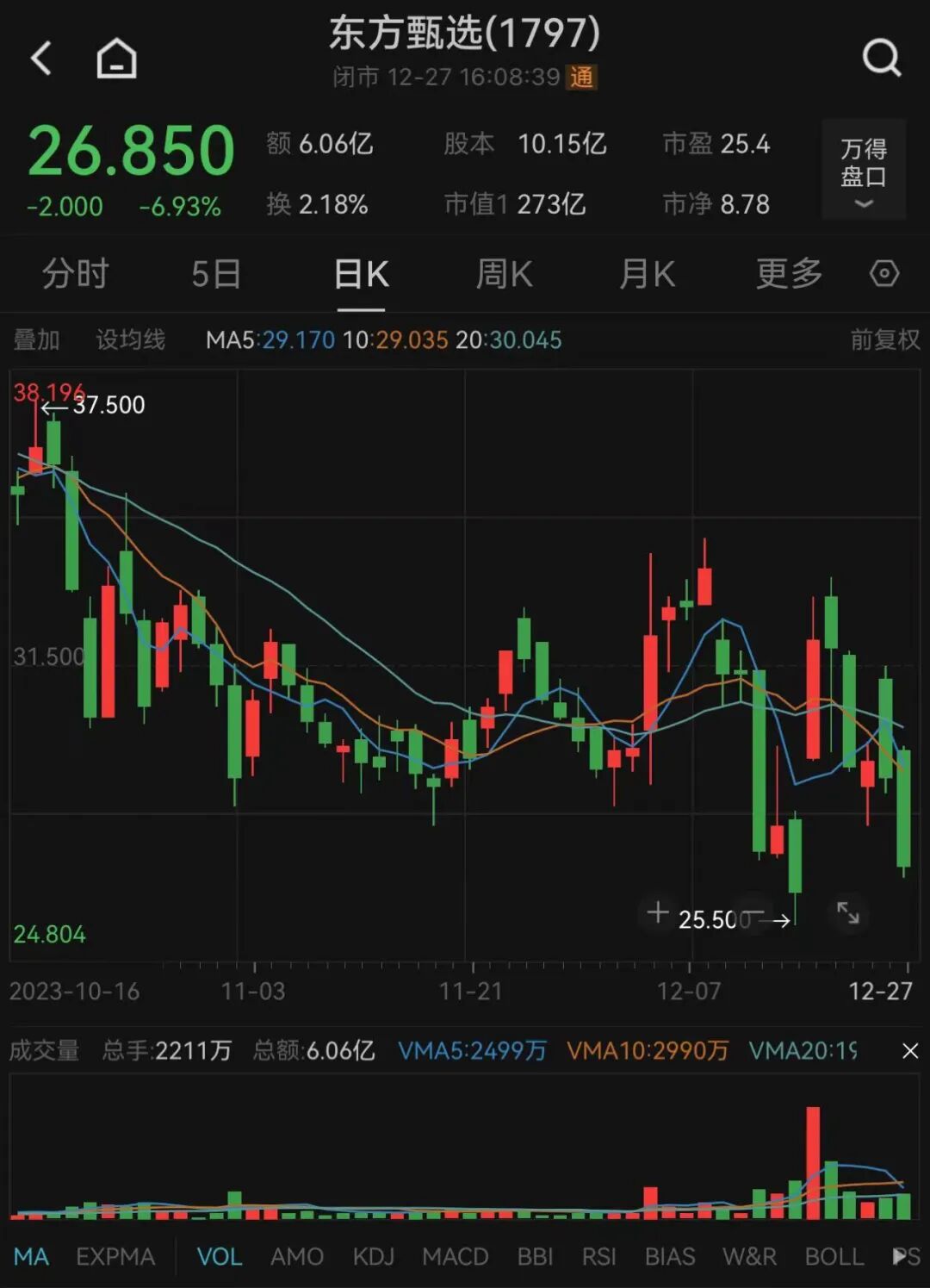 Wind数据显示,12月27日,东方甄选股价报26.85港元/股,跌幅为6.93%。