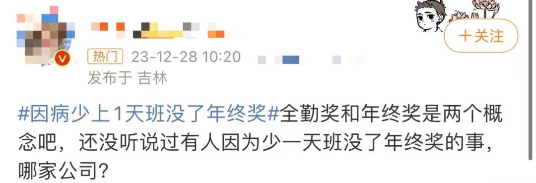 据央广网报道,12月28日,话题#因病少上1天班没了年终奖#冲上热搜。