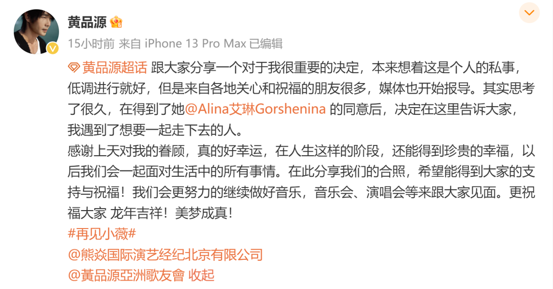 昨晚,知名歌手黄品源晒照宣布再婚!妻子是俄罗斯美女钢琴家艾琳。