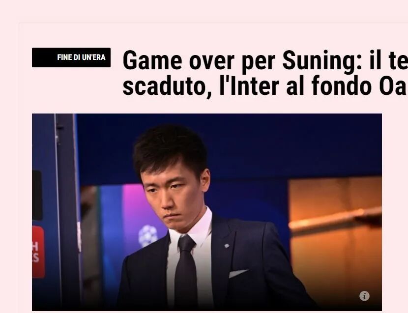据多家意大利媒体报道,由于无力偿还数额不菲的贷款和利息,国米现任主席张康阳不得不离开球队,这意味着国米的苏宁时代将落幕。根据报道内容,张康阳与基金公司约定的最后还贷期限已过,后续更多是程序步骤。