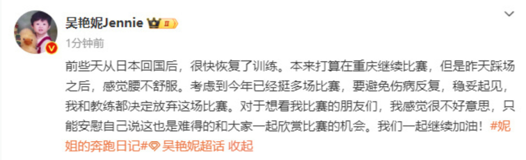 5月27日,@吴艳妮Jennie 发博:避免伤病反复,自己和教练决定放弃重庆站比赛