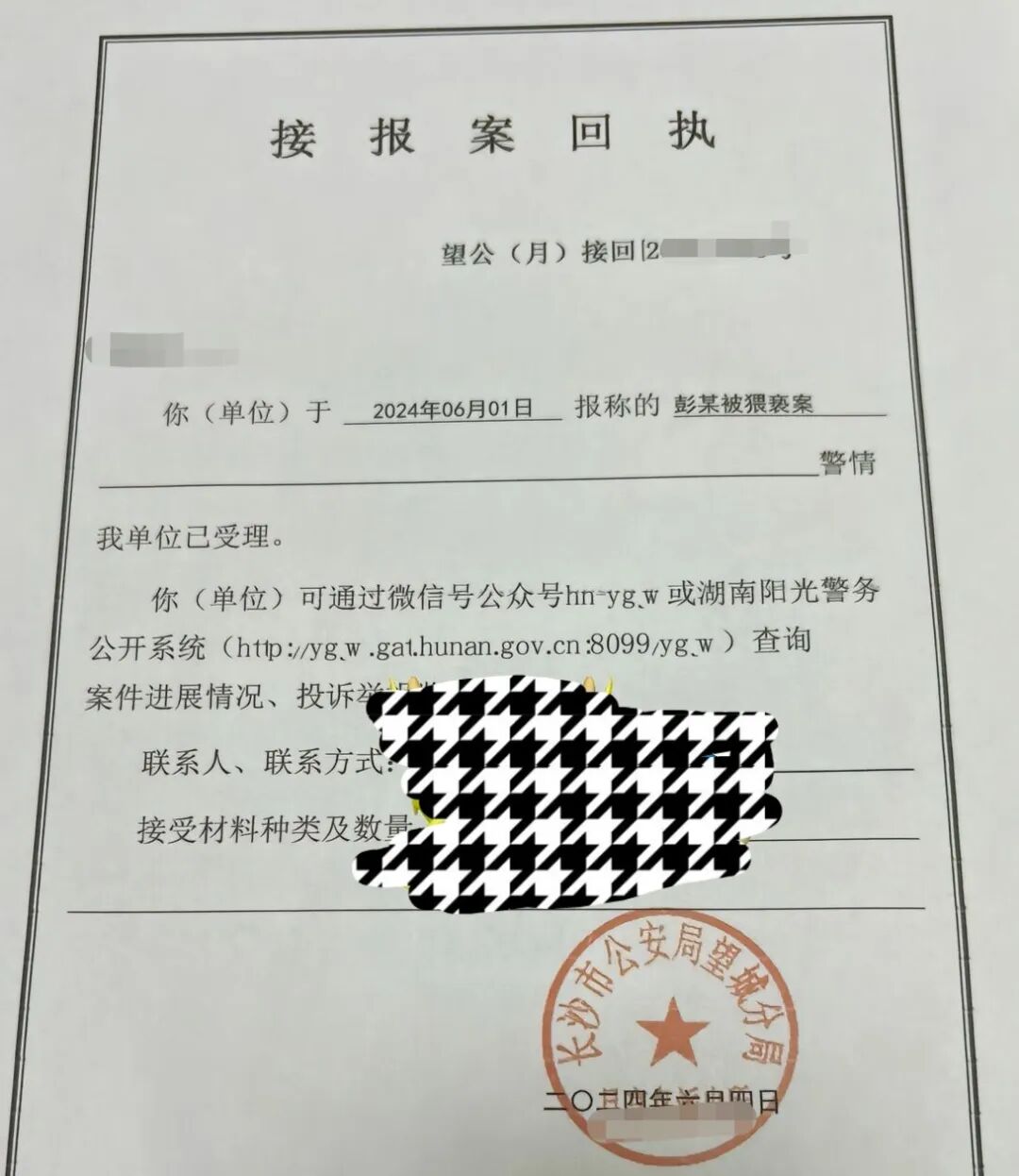 记者了解到,6月1日,彭某已经向长沙市公安局望城分局报案,警方已经受理。