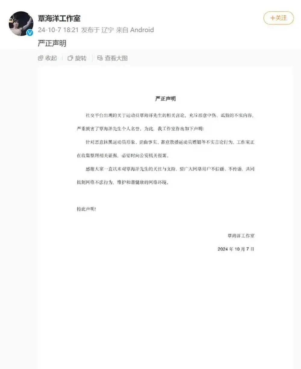 据了解,覃海洋的未婚妻是一名商人,覃海洋曾在微博中回复网友评论时称呼她为“小胖企业家”。天眼查信息显示,覃海洋的未婚妻是一家传媒文化有限公司的法定代表人,该公司主要从事商务服务业,覃海洋在该公司担任股东。此外,她担任过多家公司的法定代表人。消息发布后,相关话题登上微博热搜,网友发现,覃海洋的微博已经开启了一键防护,关闭了评论区。距离“幸福烤冷面摊主”发文3个多小时后,覃海洋工作室发表声明,称“针对恶意抹黑运动员形象、歪曲事实、蓄意散播运动员嫖娼等不实言论行为,工作室正在收集整理相关证据,必要时向公安机关报案”。