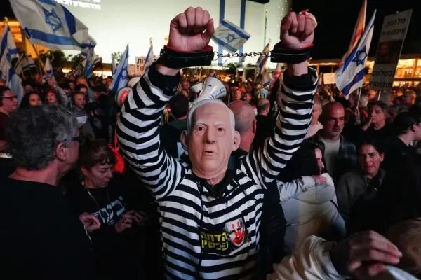 在哈比马广场,一名抗议者头戴内塔尼亚胡头套,身穿囚服被拷上手铐。半岛电视台1月6日报道配图