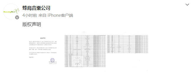从蜂鸟音乐公司微博列表可以看到,该账号上一次发文还是在2019年4月8日,那段时间该账号多次发文均与解约及相关事项有关。