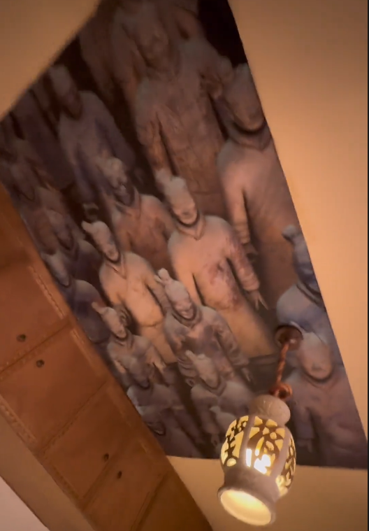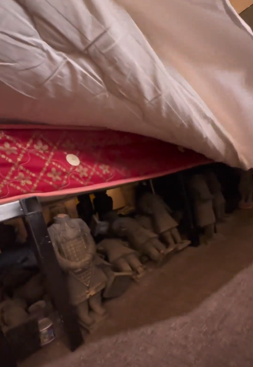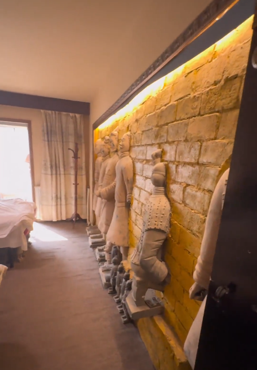 “一进来,就是三个兵马俑。”该女子发布了一个一镜到底的直拍视频:卫生间里,马桶正对面是三个兵马俑,洗手台下方是四个兵马俑作支撑柱,角落里还藏着好几个兵马俑。来到卧室,床的正对面,整面墙都是站立的兵马俑,阳台上站着两个兵马俑,“半夜到的,直接恐怖氛围拉满,最重要的是,每张床底下有无数位(兵马俑)”。餐厅里有俑马、闸刀和各种样式的武器。客厅里,电视墙的位置和沙发背后,也成排摆放着兵马俑。“最吓人的是另一个卧室,床的一侧是三个兵马俑,躺在床上望向天花板,可以与一群兵马俑对视……”
