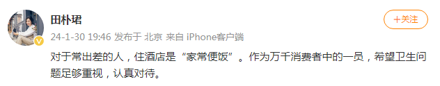 1月30日晚,田朴珺再次发文称,对于常出差的人,住酒店是“家常便饭”。作为万千消费者中的一员,希望卫生问题足够重视,认真对待。