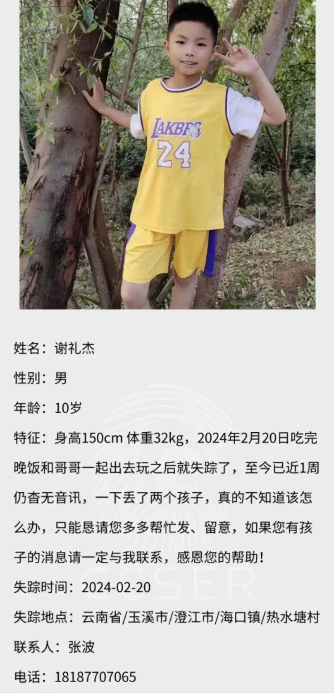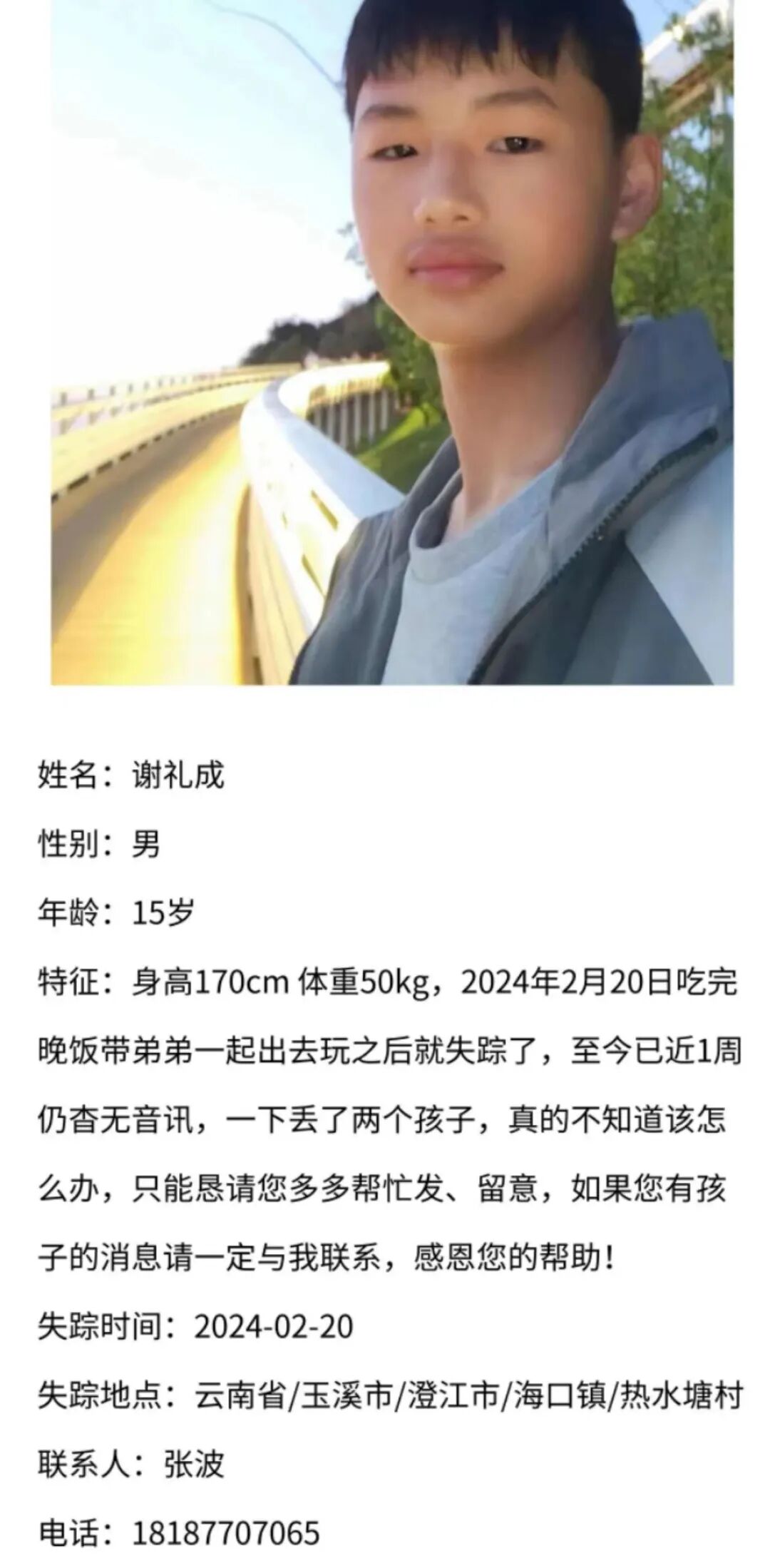 一则寻人启事显示,失踪的两兄弟中,哥哥身高170cm体重50kg,弟弟身高150cm体重32kg,2月20日晚,云南玉溪海口镇热水塘村的两兄弟,在吃过晚饭一起外出玩耍后失踪,哥哥15岁,弟弟10岁。