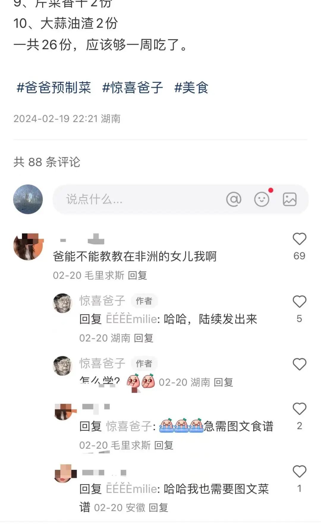 “爸爸预制菜之香卤凤爪”、“爸爸预制菜之外婆菜炒肉”、“爸爸预制菜之莲藕骨头汤”……近日,湖南长沙一位父亲每周会准备好20余份饭菜给29岁的女儿,引发不少网友关注。