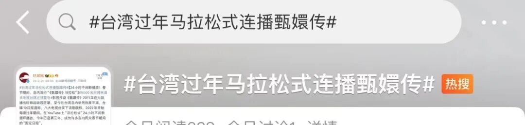 今年已是《甄嬛传》连续第3年在台湾八大电视台上马拉松式播放,观看人数再创新高。在连年热播的情况下,电视台今年甚至呼应众网友要求,在最后一轮直播特地跳过甘露寺部分剧情,满足观众“一键回宫”心愿。