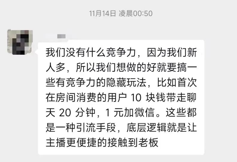 直播间看起来平常的聊天,也会暗藏软色情。张靓说,每周例会上,MCN会督促她们去找“大哥”,发给她们整理好的暧昧话术,并说,“你们跟‘大哥’说话,不用费多少心思,网上腿图这么多,随便找点不就行了吗?聊暧昧都不会嘛!”