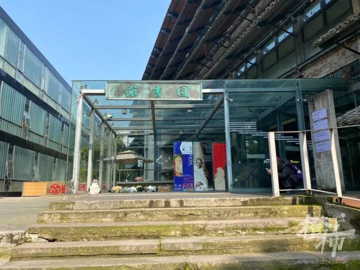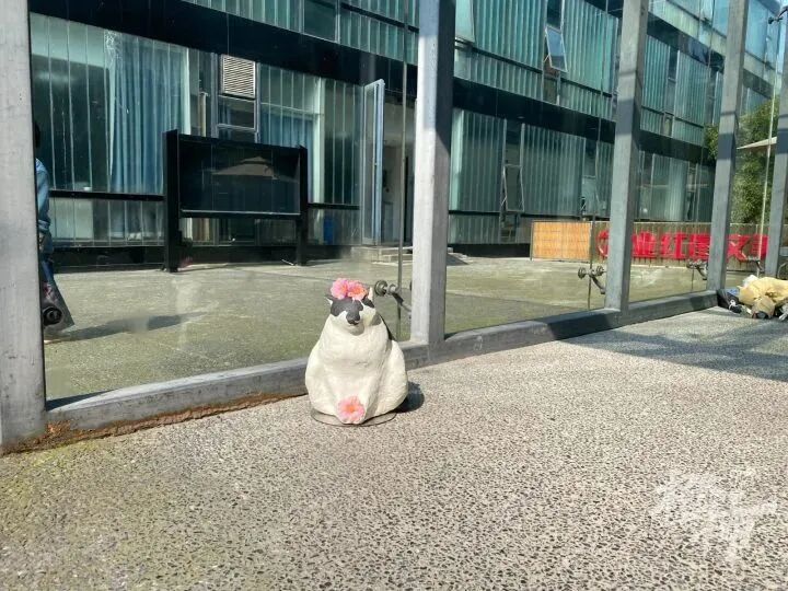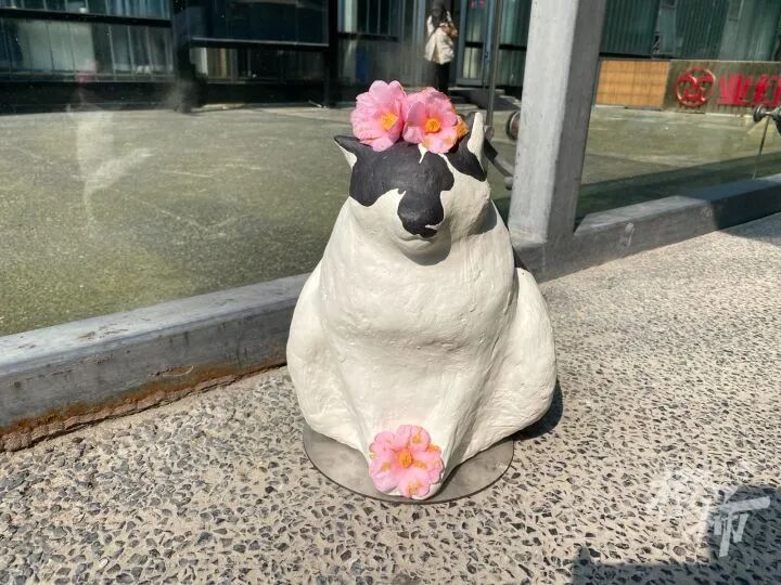 图书馆门口地上有一尊小雕像,是学生照它的样子做的,很多人经过都会蹲下抚摸雕像。“实在太像了,它太可爱了。”还有学生给“喵馆长”雕像戴了几朵小红花。