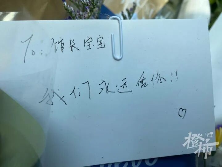 “喵馆长”的照片前,还放着学生们送的小卡片。“我们会永远爱你。”“馆长宝宝,感谢陪伴,去幸福的喵星,一路画像,望你安眠。”……