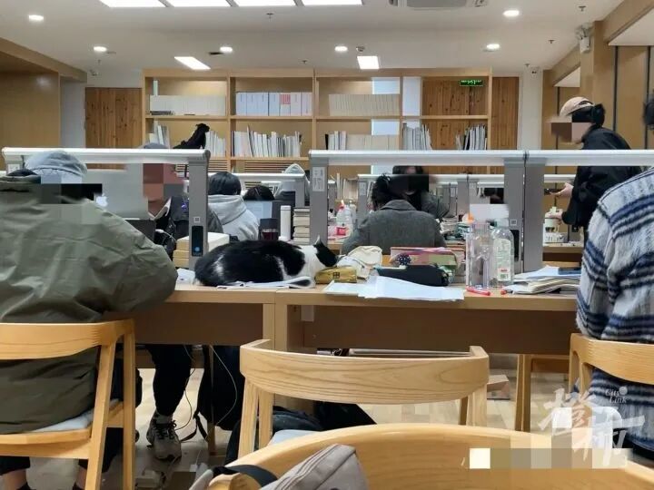 这位同学说,“喵馆长”在自习室,很多同学都会觉得很轻松。“真的,自习学习紧张或想要休息时,每次看到它,心情就会很放松,看到它就是一种治愈,它真的很可爱,从来不吵不闹。”