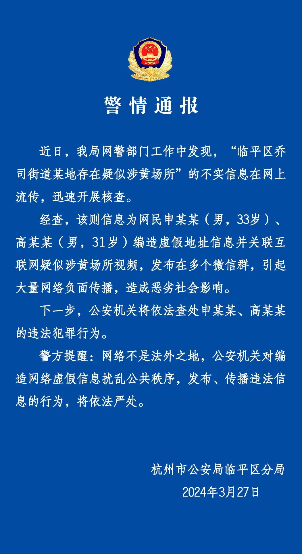 通报称,近日,杭州市公安局网警部门工作中发现,“临平区乔司街道某地存在疑似涉黄场所”的不实信息在网上流传,迅速开展核查。