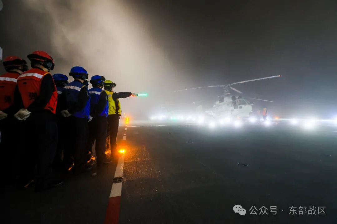 参与训练的舰载直升机,克服黑夜、大雾、无明显参照物,以及复杂海况等多重挑战。飞行员们凭借精湛技艺,与塔台指挥员默契配合,出色完成着舰任务。