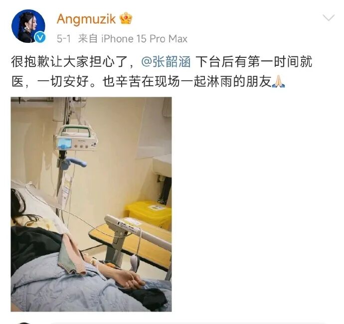 第二日(5月1日)凌晨,张韶涵经纪公司曾发微博表示:“很抱歉让大家担心了,张韶涵下台后有第一时间就医,一切安好。也辛苦在现场一起淋雨的朋友。”