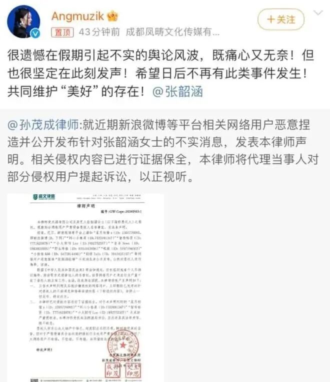 随后,张韶涵经纪公司转发律师声明称,发生这样的事“既痛心又无奈”,“希望共同维护美好的存在”。