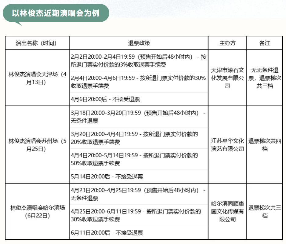 报告指出,林俊杰5月25日苏州场演唱会、6月22日哈尔滨场演唱会以及4月13日天津场演唱会的退票政策不统一,容易对消费者造成误导。