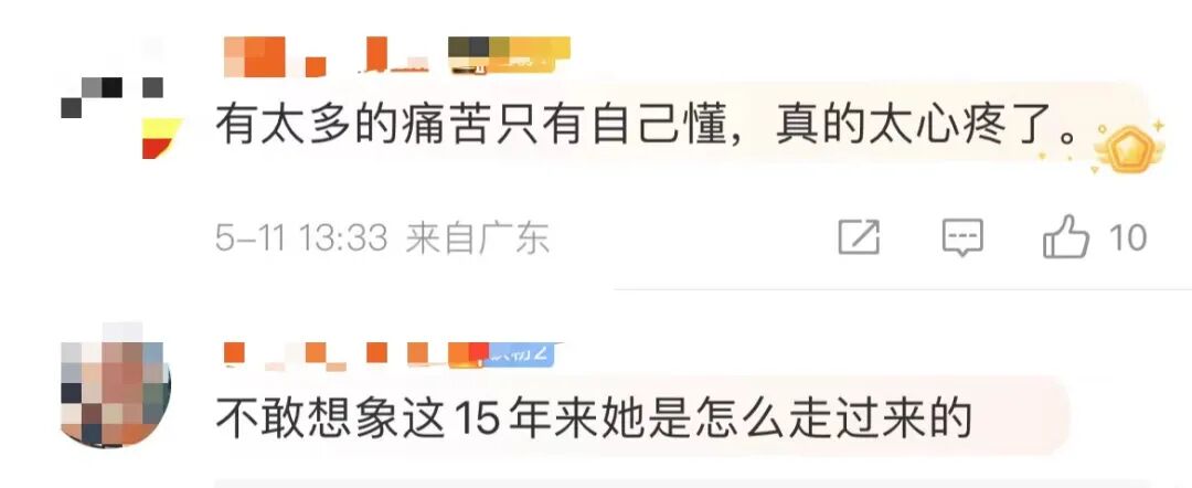 对此,网友纷纷表示:“能够挺过来,真的很不容易”“真的很想抱抱她”“不敢想象这15年她是怎么走过来的”。