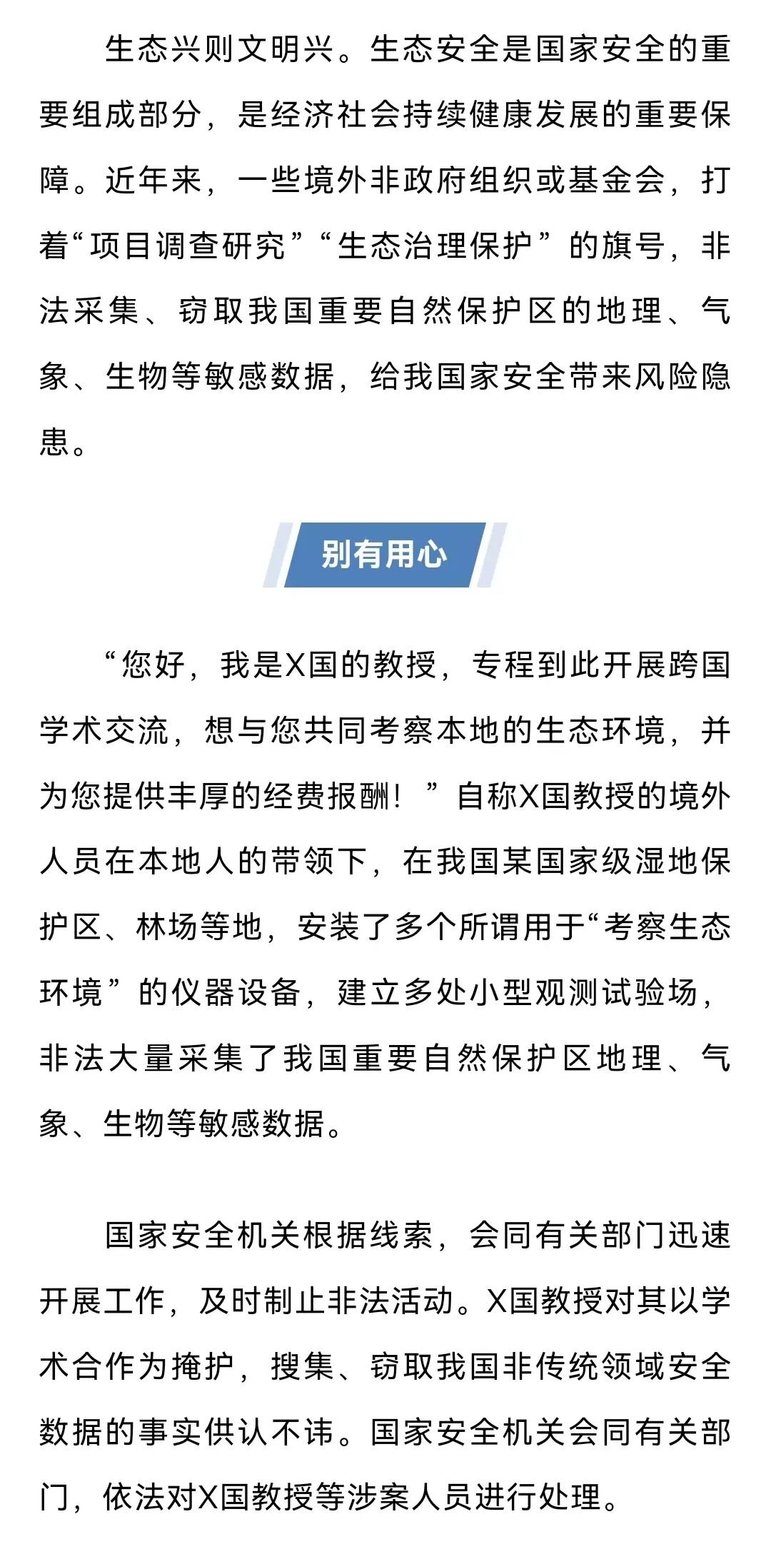 自称X国教授的境外人员以学术合作为掩护,在我国某国家级湿地保护区、林场等地安装仪器设备,建立多处小型观测试验场,非法大量采集我国重要自然保护区地理、气象、生物等敏感数据。
