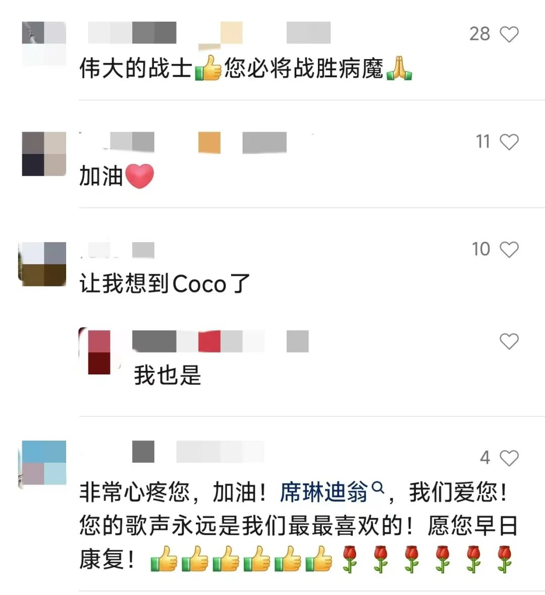 看到最新视频中坚强的迪翁,网友纷纷送上祝福:愿早日康复!永不放弃!