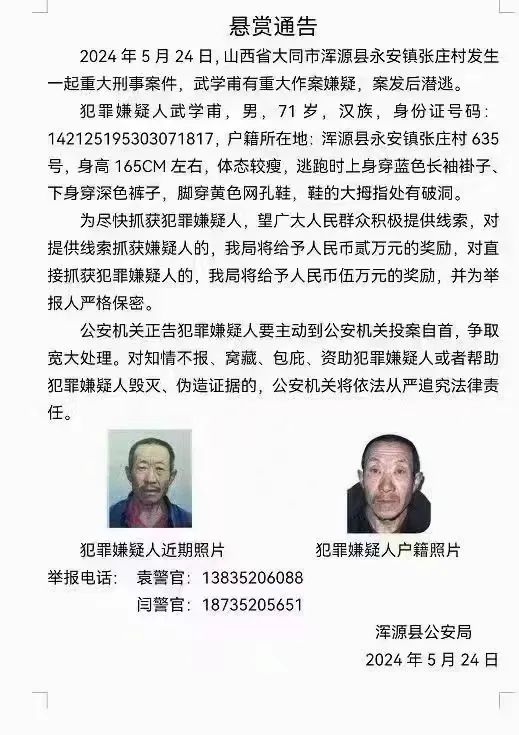 当天,浑源县公安局发布悬赏通告称,武学甫有重大作案嫌疑,案发后潜逃。
