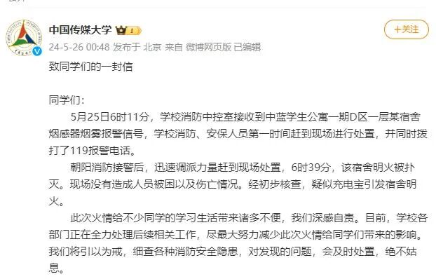 我们注意到网络上一些关于“烟感器未报警”“消火栓失灵”等关于此次火情的传言。事实上,该宿舍区不存在上述问题,因为烟感报警器是专给学校中控室报警,中控室第一时间收到烟感器报警信号并立即启动应急处置,消火栓也完全能够正常使用。同时我们通过“中传有我”建言献策平台,收到不少同学关于改进消防工作的建议,我们会仔细研究,好好改进。