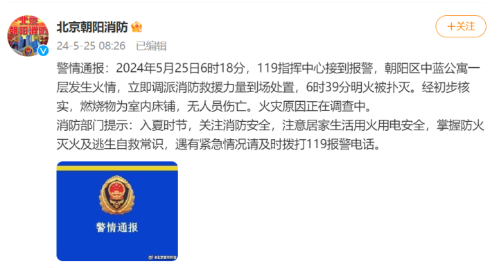 2024年5月25日6时18分,119指挥中心接到报警,朝阳区中蓝公寓一层发生火情,立即调派消防救援力量到场处置,6时39分明火被扑灭。经初步核实,燃烧物为室内床铺,无人员伤亡。火灾原因正在调查中。