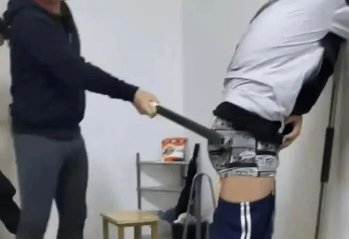 另有多段视频显示,于某某让一名学生趴在地上,拿一根木棍击打学生臀部,木棍断裂;拿一个铁制刀具、铁棍,依旧是击打学生臀部,学生发出惨叫声。