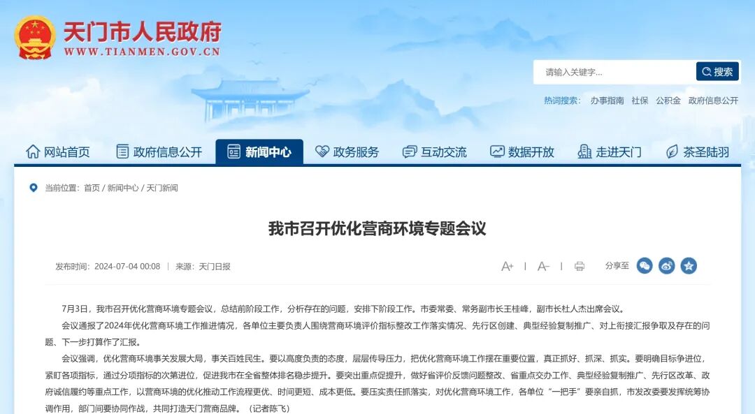 据“天门市人民政府”官网报道,7月3日,天门市召开优化营商环境专题会议,总结前阶段工作,分析存在的问题,安排下阶段工作。市委常委、常务副市长王桂峰,副市长杜人杰出席会议。