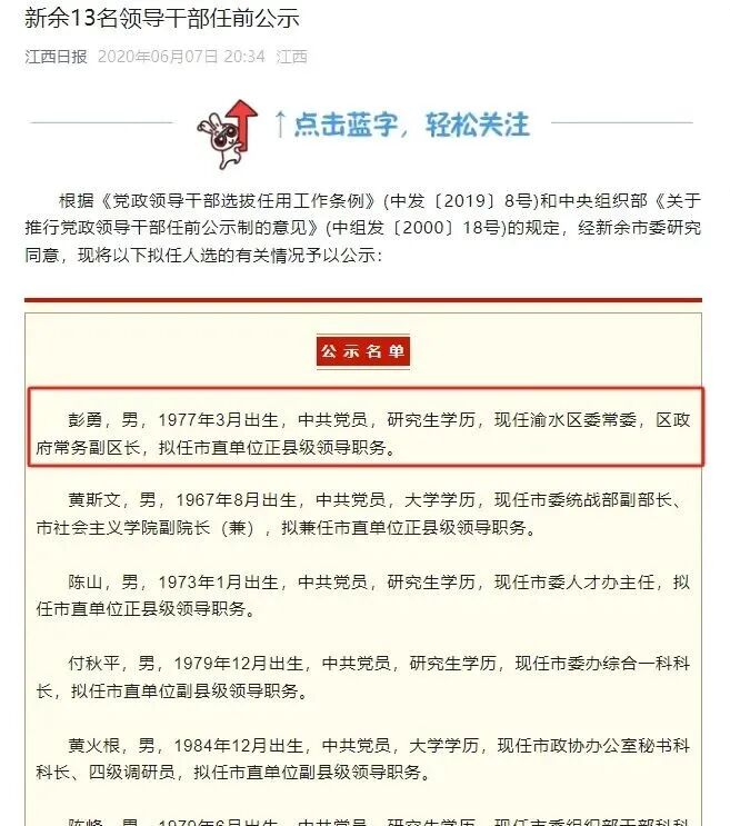 2020年6月,新余市委组织部发布任前公示,时任渝水区委常委,区政府常务副区长彭勇,拟任市直单位正县级领导职务。当时的公示信息显示:彭勇,男,1977年3月出生,中共党员,研究生学历。