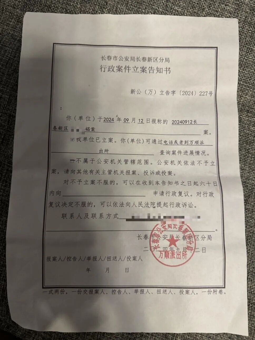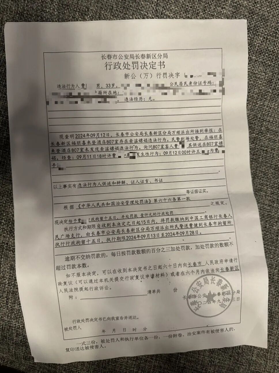 王女士发布了两份文件截图,一份是长春市公安局长春新区分局的行政案件立案告知书,显示:9月12日报称的“20240912长春新区曹某嫖娼案”已立案。一份是长春市公安局长春新区分局行政处罚决定书,显示:现查明2024年9月12日,长春市公安局长春新区分局万顺派出所接到举报,在长春新区福朋喜来登酒店807室存在卖淫嫖娼违法行为。民警到场处警,在福朋喜来登酒店807室未发现卖淫嫖娼违法行为。询问807室客人曹某,其供述在807室先后两次嫖娼。现决定给予曹某行政拘留十五日,并处罚款1000元的行政处罚。