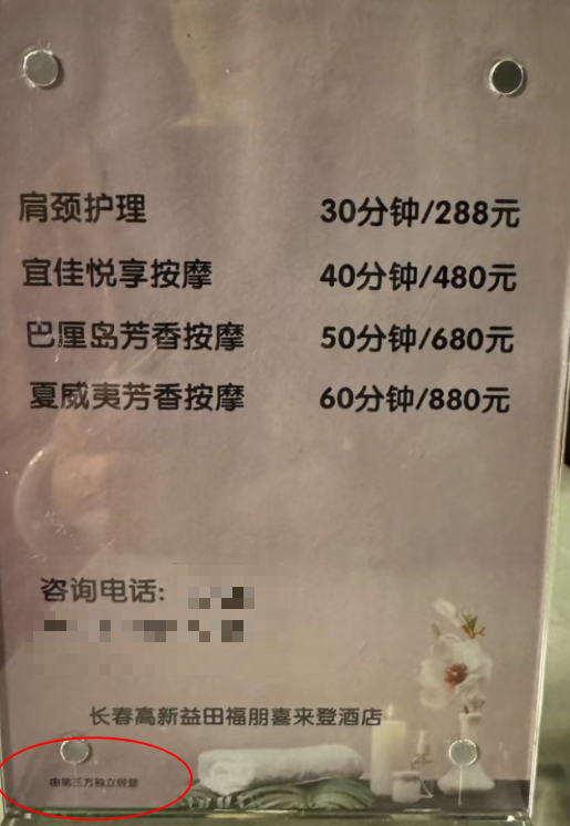 王女士提供的酒店按摩牌显示,长春高新益田福朋喜来登酒店,提供肩颈护理等多种按摩服务,并写有咨询电话。左下角有一行小字,“由第三方独立经营”。