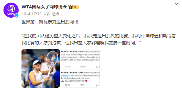 10月4日,据@WTA国际女子网球协会 消息,世界排名第一的斯瓦泰克也退出了本届武网。此前,她也曾宣布退出中国网球公开赛。
