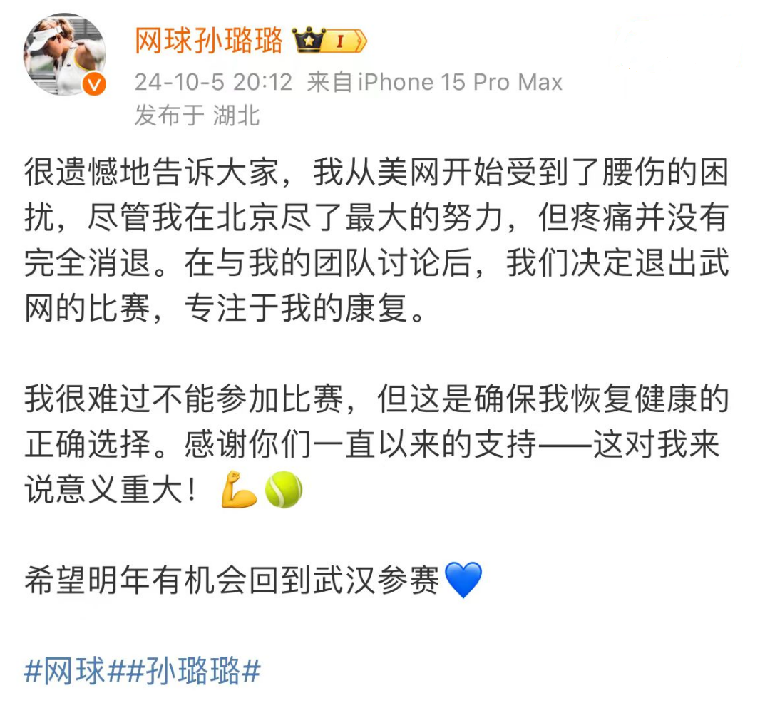 孙璐璐在社交平台上写道:“很遗憾地告诉大家,我从美网开始受到了腰伤的困扰,尽管我在北京尽了最大的努力,但疼痛并没有完全消退。在与我的团队讨论后,我们决定退出武网的比赛,专注于我的康复。”
