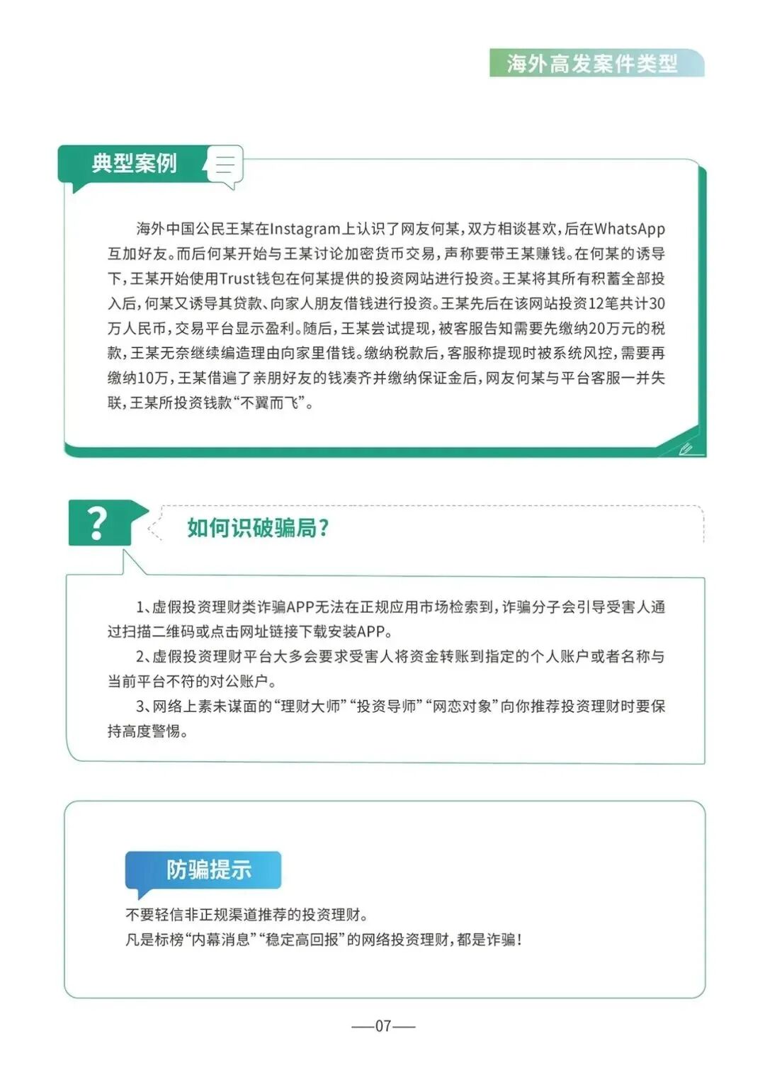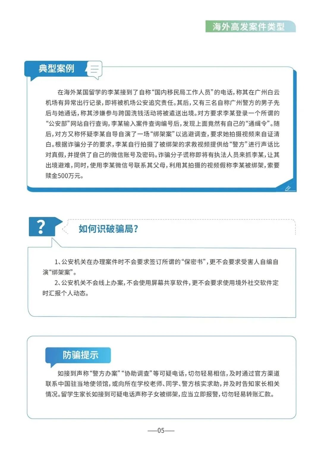 2024年6月27日,国家反诈中心联合外交部领事保护中心和教育部留学服务中心制作推出《海外防范电信网络诈骗宣传手册》,其中盘点了多种海外高发诈骗类型。