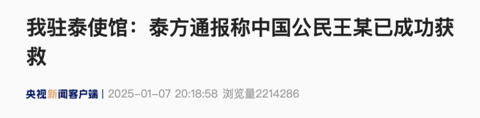 据泰方通报,中国公民王某已于当地时间7日下午成功获救,中国驻泰使领馆对泰国政府及其他有关各方为此所作努力和富有成效的工作表示感谢。