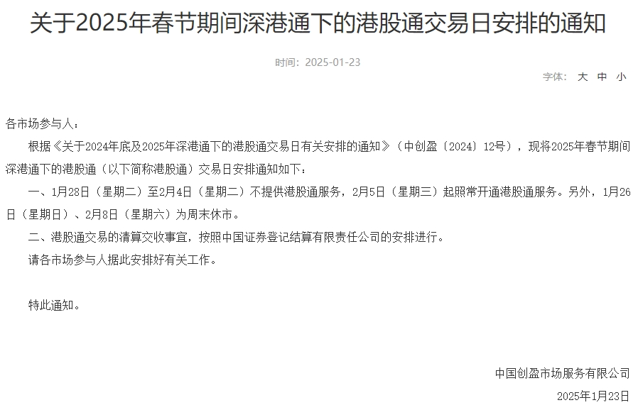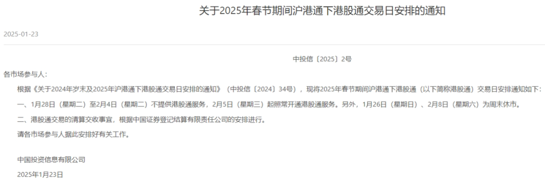 港股通方面,沪深交易所明确,1月28日(星期二)至2月4日(星期二)不提供港股通服务,2月5日(星期三)起照常开通港股通服务。另外,1月26日(星期日)、2月8日(星期六)为周末休市。