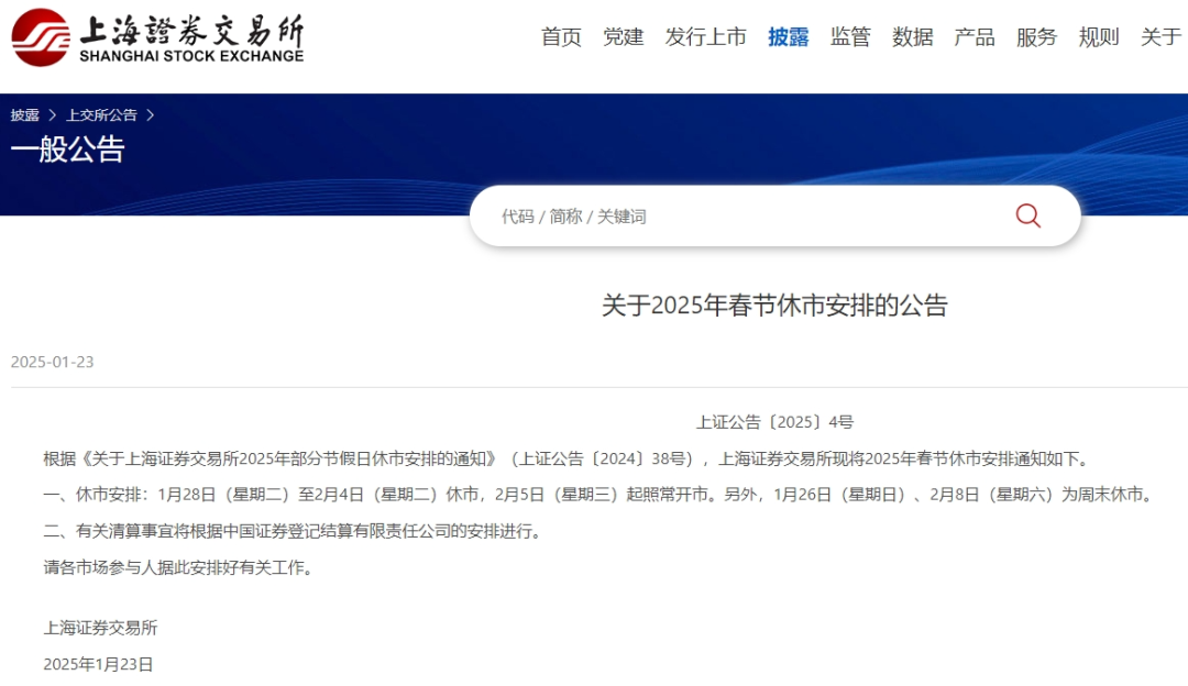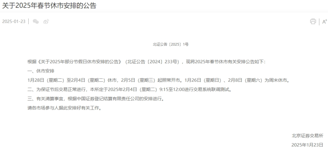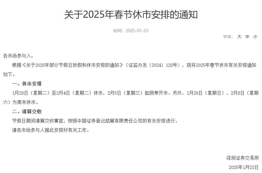 1月23日,沪深北交易所分别发布关于2025年春节休市安排的通知。据通知,1月28日(星期二)至2月4日(星期二)休市,2月5日(星期三)起照常开市。另外,1月26日(星期日)、2月8日(星期六)为周末休市。