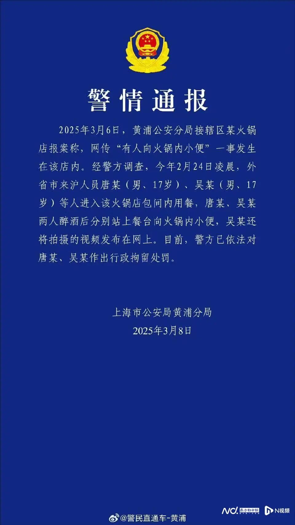 3月8日,据上海市公安局黄浦分局通报:3月6日,黄浦公安分局接辖区某火锅店报案称,网传“有人向火锅内小便”一事发生在该店内。经警方调查,今年2月24日凌晨,外省市来沪人员唐某(男、17岁)、吴某(男、17岁)等人进入该火锅店包间内用餐,唐某、吴某两人醉酒后分别站上餐台向火锅内小便,吴某还将拍摄的视频发布在网上。目前,警方已依法对唐某、吴某作出行政拘留处罚。