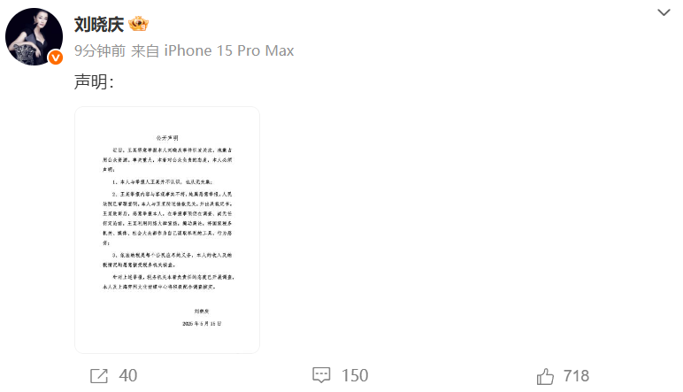 5月15日,演员刘晓庆发布声明称:“本人与举报人王某并不认识,也从无交集。王某举报内容与客观事实不符,纯属恶意举报。”