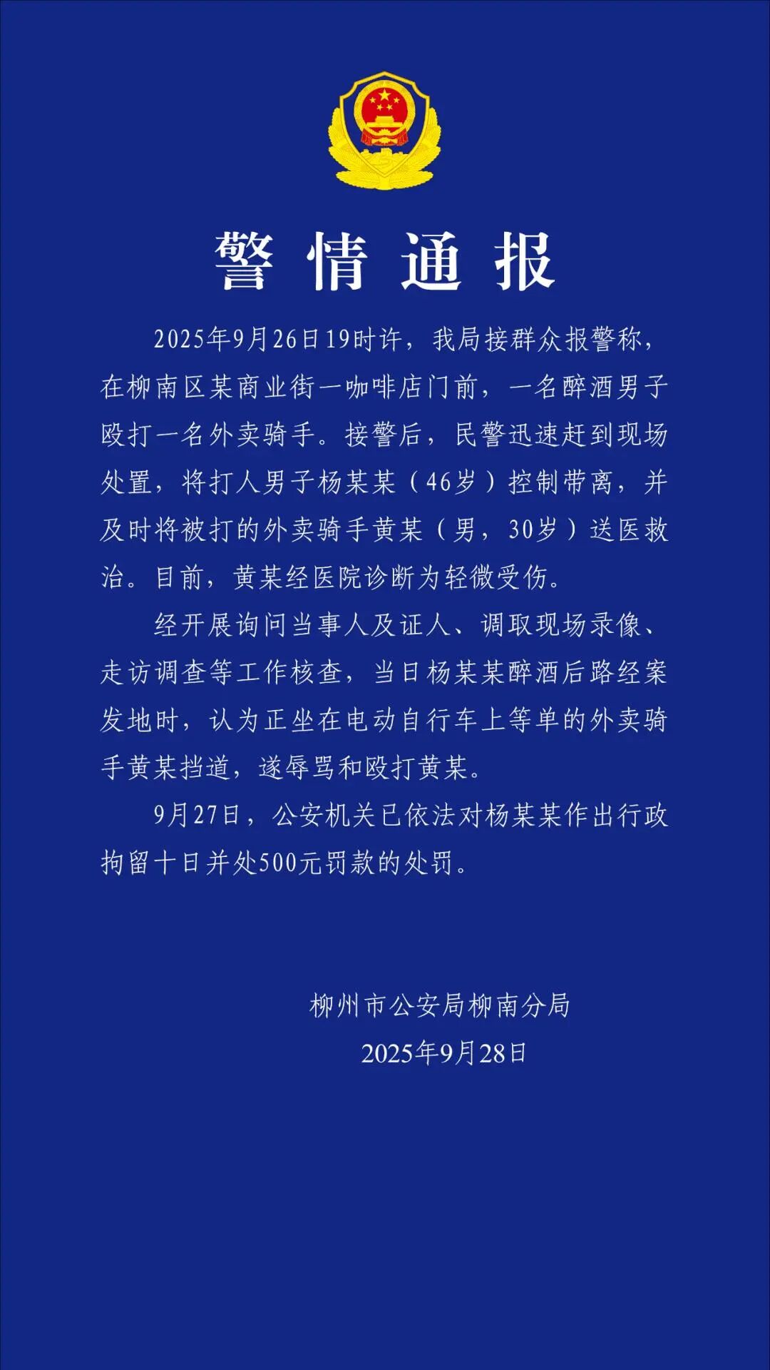 9月28日,柳州市公安局柳南分局发布警情通报,称9月26日19时许,该局接群众报警称,在柳南区某商业街一咖啡店门前,一名醉酒男子殴打一名外卖骑手。