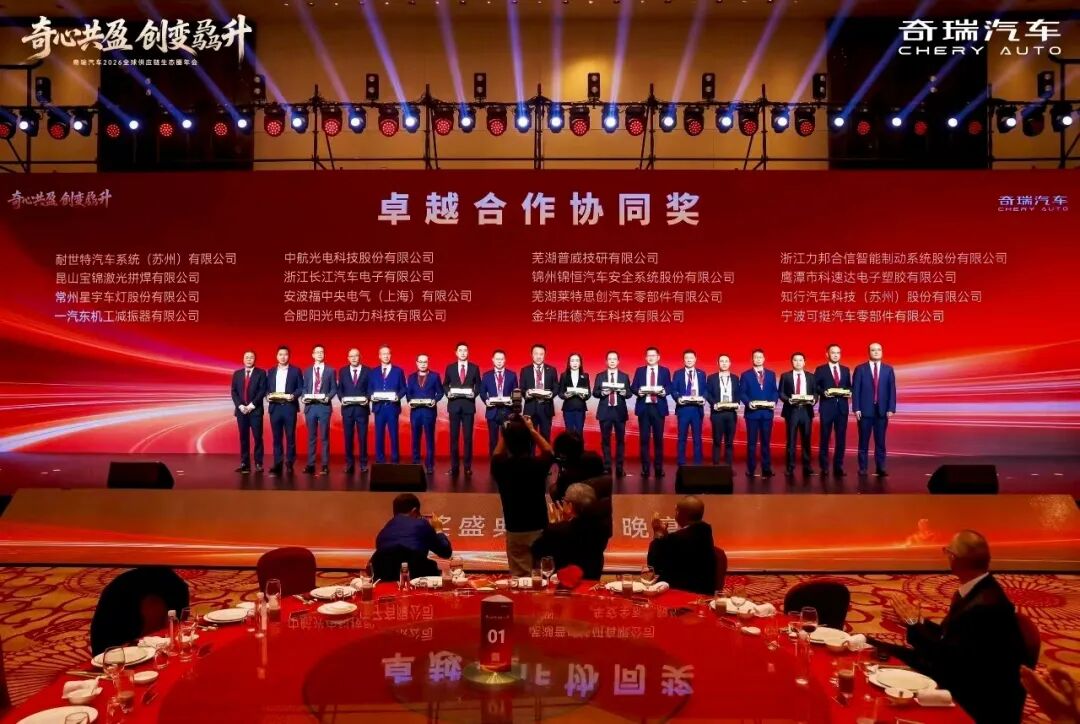 2026年1月16日,以"奇心共盈,创变骉升"为主题的奇瑞汽车2026年全球供应链生态圈年会在安徽芜湖成功举办。本次大会汇聚全球1300余名供应商代表,由黄山高新区控股的芜湖莱特思创汽车零部件有限公司凭借突出的协同创新能力与战略合作价值,荣获大会授予的“卓越合作协同奖”。